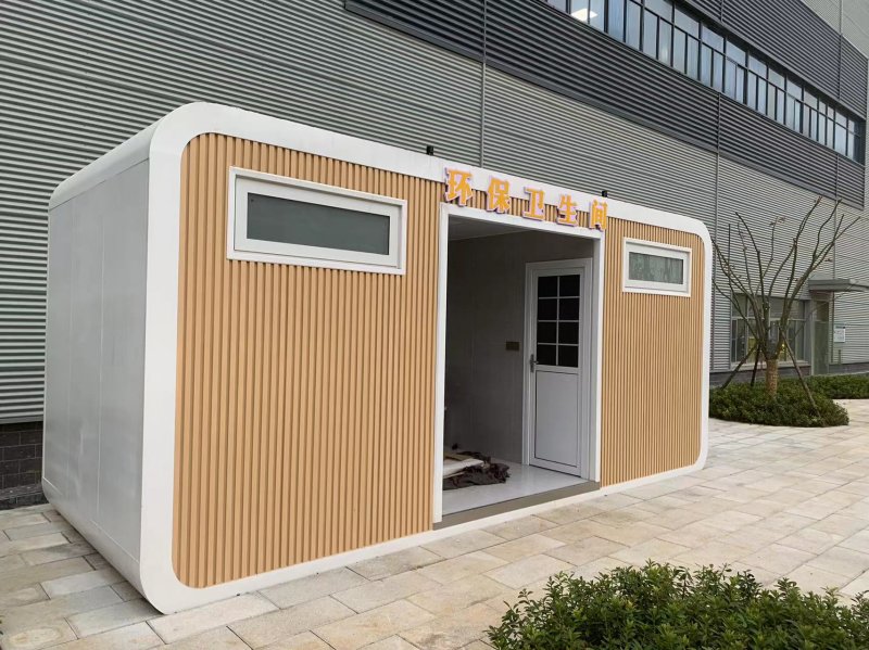 拼裝廁所;在廠里做好各個廁所部件,再到現場組裝在一齊,適合不易運輸的大型廁所。這座箱式廁所,女廁5個蹲位內配工具間,男廁2個蹲位+2小便斗,第三衛生間由殘疾馬桶、助力洗手盆和兒童馬桶、兒童洗手盆外加嬰兒臺等設施。廁所前后有窗,通風采光,前部走廊裝有屋檐,防雨防曬。此廁所位于公路綠道邊,整體大氣,功能齊全,造型美觀,是一道難得的靚麗景觀!
